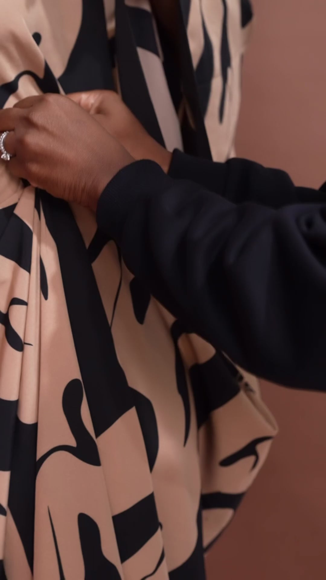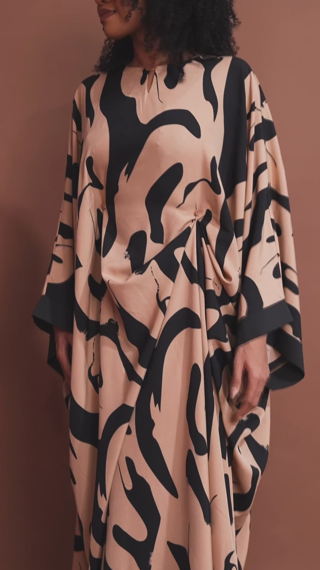 The Latifa Boubou features a flowing, full-length silhouette with a modern abstract print. Made from a lightweight rayon–polyester blend, it offers comfort and ease of movement. Designed with two inner cords to adjust the waist, a button closure, and an invisible back zipper for easy wear and a clean finish.