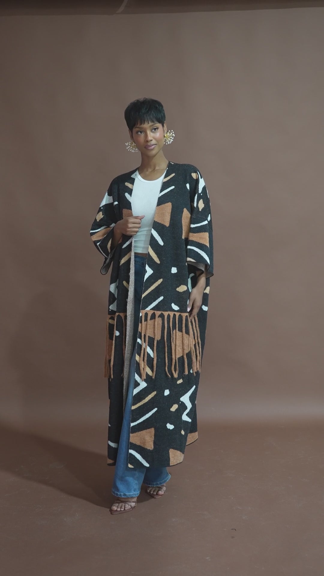 Our Bogolan Knit Kimono brings warmth and statement style to any look. Designed with an oversized relaxed fit, it features authentic bogolan-inspired patterns and long fringe details that move beautifully with every step.