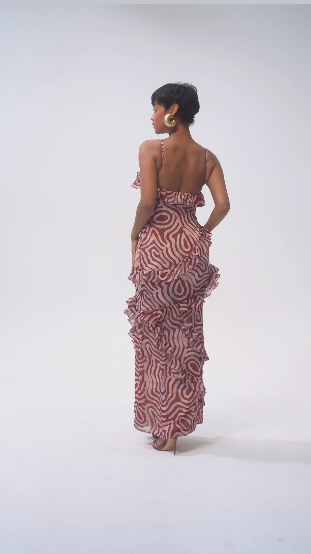 Meet the dress that blends elegance, movement, and modern African flair. Designed with a unique swirl print and cascading ruffle details, this maxi dress brings effortless sophistication to any occasion. The lightweight, flowing fabric enhances every step while the flattering neckline adds a feminine finish.